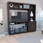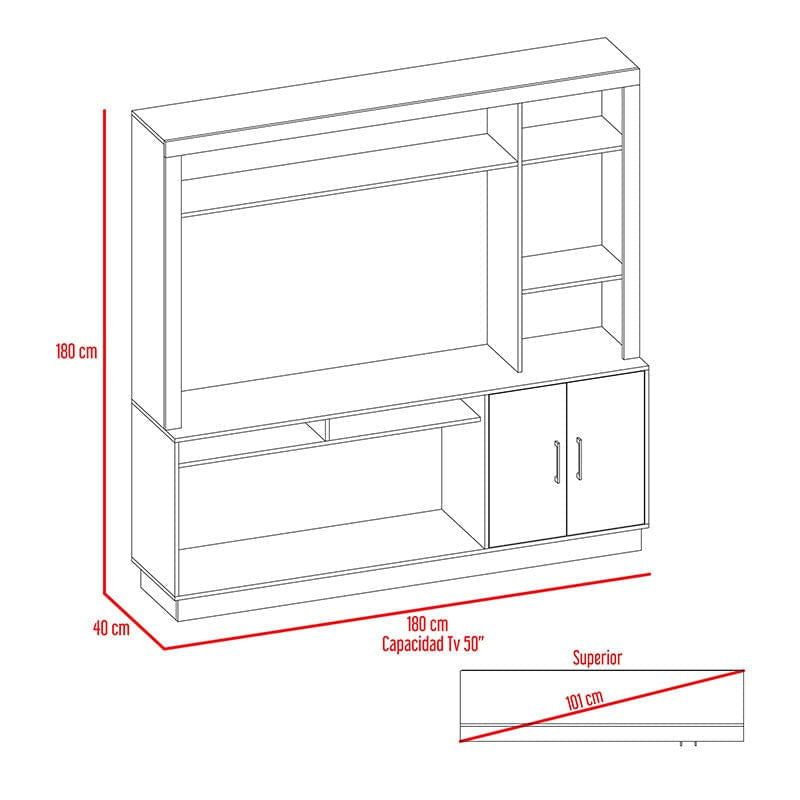 Mesa para TV, con 2 puertas abatibles, espacio central para TV hasta de 50”, y espacio inferior para colocar equipos de audio y video o home theater.
