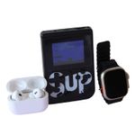 Disfruta una experiencia completa de entretenimiento y tecnología con este combo 3 en 1 que incluye consola portátil retro, reloj inteligente y audífonos inalámbricos. Perfecto para quienes buscan diversión, estilo y funcionalidad en un solo paquete. Revive tus juegos clásicos favoritos, escucha música con sonido envolvente y mantén tu día bajo control con el smartwatch. Ideal para regalar o disfrutar todos los días, con diseño moderno, conexión estable y batería duradera para acompañarte en cualquier momento.