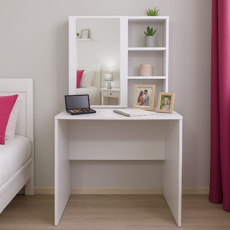 Combo Tocador moderno con repisas color Blanco en melamina en 15 mm, con protección antimicrobiana al 99.9%, incluye puerta con espejo. Ideal para dormitorio ó espacios pequeños + Silla en polipropileno Blanca