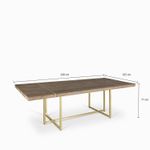 Una mesa de comedor con mucha presencia e ideal para largas comidas o cenas con familia y amigos. Con un amplio tablero rectangular en madera de pino reciclado, que contrasta con su estructura en metal dorado de diseño moderno. Una mesa espaciosa en la que podrás acoger hasta a 8 comensales.