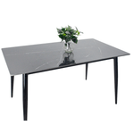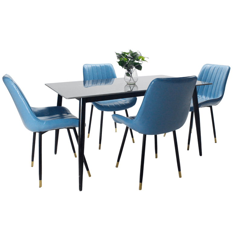 Este comedor ha sido diseñado para quienes buscan estilo, funcionalidad y confort en un solo espacio. Su estructura robusta y acabados elegantes lo convierten en la opción perfecta para realzar el ambiente de tu hogar, proporciona Elegancia y estilo y se unen en este comedor con mesa de superficie tipo mármol y sillas tapizadas en cuero sintético acanaladas. Sus patas negras con detalles dorados añaden un toque sofisticado ideal para espacios contemporáneos. Perfecto para tu hogar o apartamento moderno