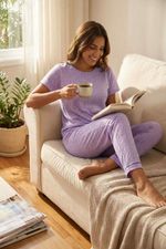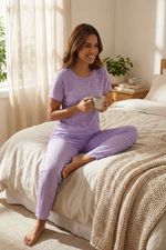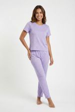 Conjunto pijama de dos piezas confeccionado en poliester de tacto suave, un material que brinda un alto nivel de comodidad y resistencia. Esta conformada por una camiseta con mangas cortas y cuello redondo. El pantalón largo semiajustado a juego incluye un elástico interno en la cintura para un ajuste perfecto.