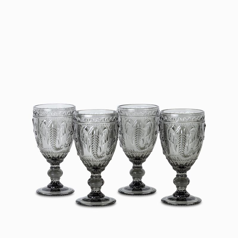 Set de cuatro (4) copas en vidrio de color gris, de estilo vintage con figuras étnicas en las que resalta la cabeza de un elefante en alto relieve e ideales para crear mesas de inspiración animal. Son idóneas para ofrecer cocteles, smoothies, aguas saborizadas, jugos o agua con las comidas.