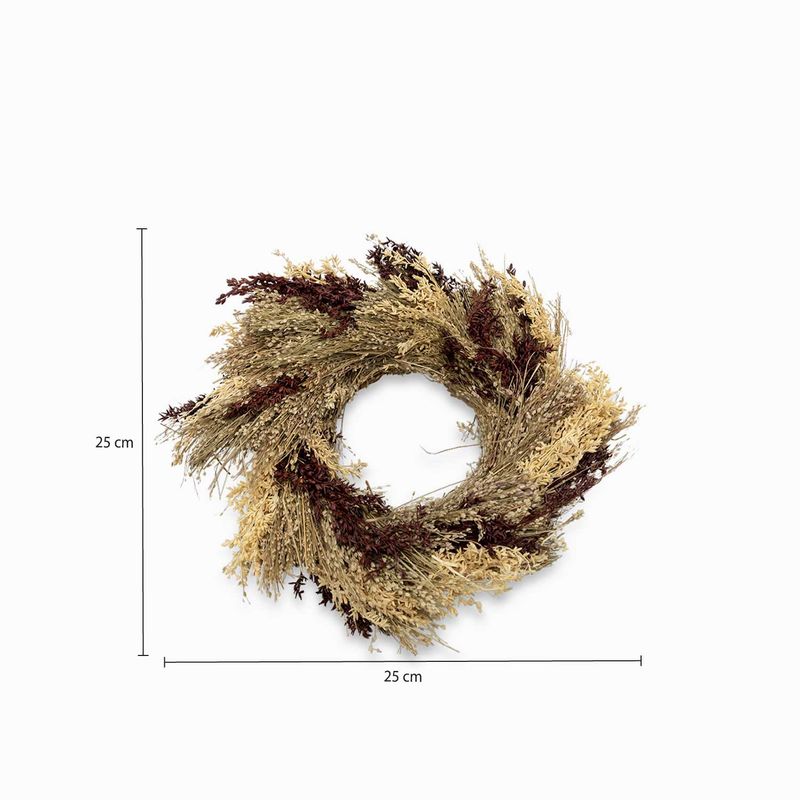 Corona decorativa compuesta con flores naturales secas, ideal para decorar mesas, puertas o interiores. Es de fácil cuidado: no requiere cuidados especiales, no atrae insectos y es fácil de limpiar.