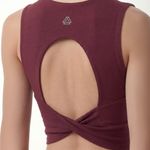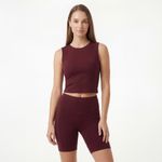 Crop top deportivo para mujer en color burgundy, con manga sisa y abertura en la espalda que favorece la ventilación. El diseño incluye un detalle de ruedo cruzado y un logo reflectivo para mayor visibilidad durante el entrenamiento. Este top ofrece flexibilidad, comodidad y rendimiento.