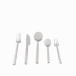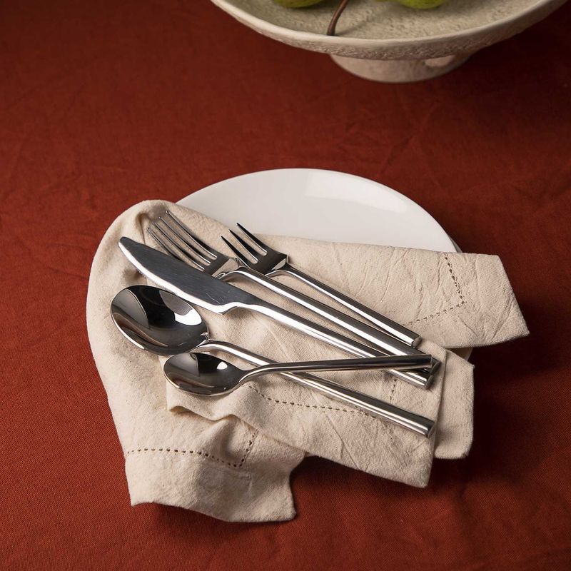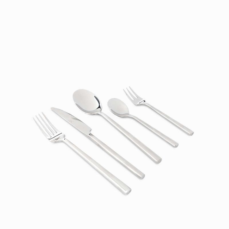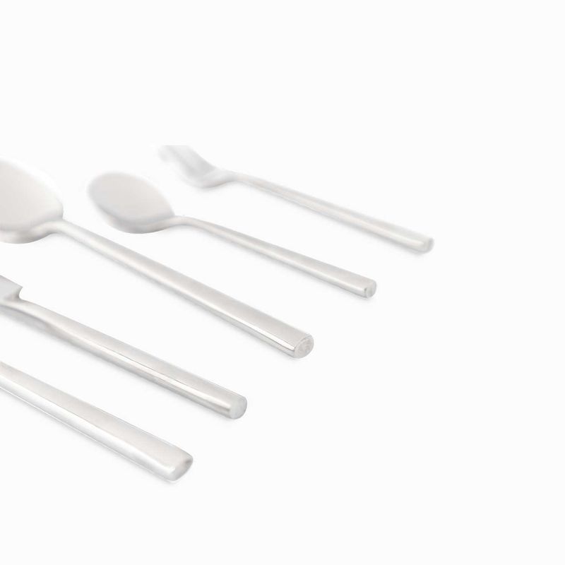 Cubiertos en acero inoxidable de color plateado. Caracterizados por su diseño sofisticado, moderno y encantador que permite adecuarse a cualquier ocasión agregando brillo a la mesa. El juego está compuesto por veinte piezas para servir y cuatro puestos que contienen: tenedor, cuchara, cuchillo para plato principal además de tenedor y cuchara para postre.