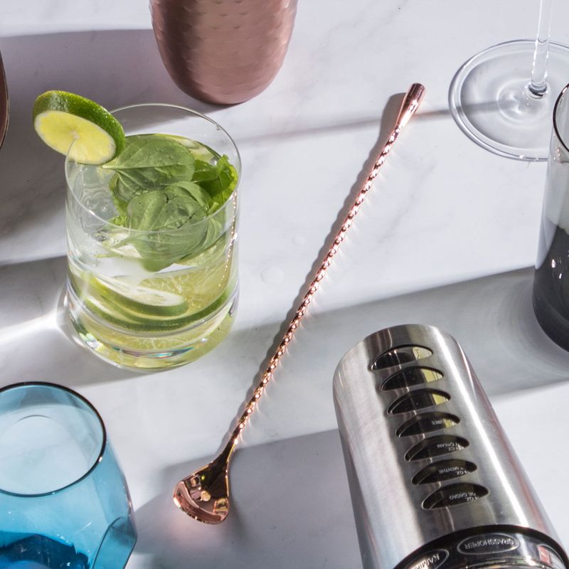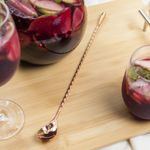 Cuchara en acero inoxidable con mango largo para batir los cocteles al momento de su preparación o de servir la bebida, ya que hace más fácil mezclar y remover sus ingredientes. Solo basta con girar suavemente la cuchara desde el bode del vaso mezclador o jarra. También se utiliza para refrescar la copa donde se sirve el coctel haciendo girar los cubos de hielo para que enfríen la bebida.