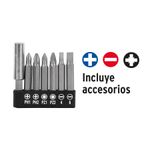 Destornillador 3.6V, PRO • LED para iluminar el área de trabajo • Bloqueo de seguridad • Porta puntas magnético hexagonal 1/4" • Mango con grip antiderrapante • Para atornillar Especificaciones Entrada hexagonal 1/4" Torque máximo 35 lb/ft (4 Nm) Velocidad 220 rpm Largo de puntas 2" (50 mm) Tiempo de recarga 1 h 40 minutos Capacidad de batería 1.3 Ah Voltaje de batería 3.6 V Especificaciones del cargador 127 V / 60 Hz / 25 W Incluye Batería integrada de Ion Litio 1.3 Ah Extensión magnética hexagonal 2 Puntas planas (4 mm y 6 mm) 2 Puntas phillips (PH1 y PH2) 2 Puntas pozidriv (PZ1 y PZ2) Cargado