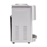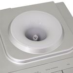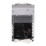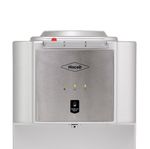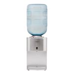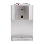 Dispensador de agua plateado con placa en inox con indicadores luz led y botones dispensadores de agua para cada temperatura Caliente, frío y al clima y sistema de seguridad para niños en el modo de agua caliente. Con capacidad en la parte superior para botellones de 20 litros en la parte superior.
