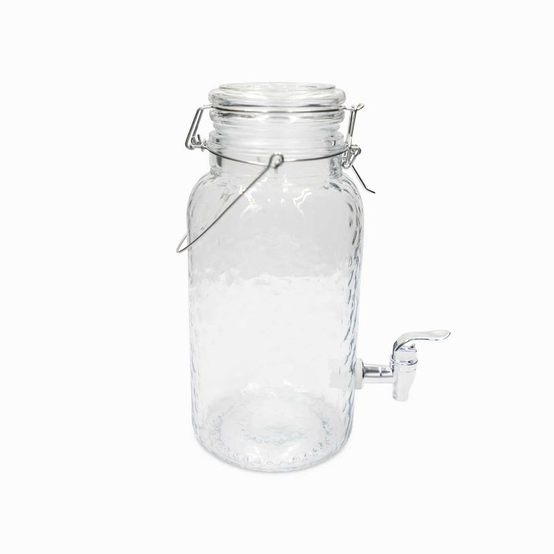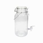 Dispensador de bebidas frías de vidrio, con capacidad para 3800 ml y grifo anti goteo. Su estilo un tanto rustico y campestre, lo ha convertido en uno de los accesorios infaltables en eventos y fiestas al aire libre. Se usa para presentar aguas saborizadas o cocteles con ingredientes naturales en mesas de autoservicio. Su tapa es hermética para evitar derrames.