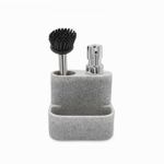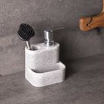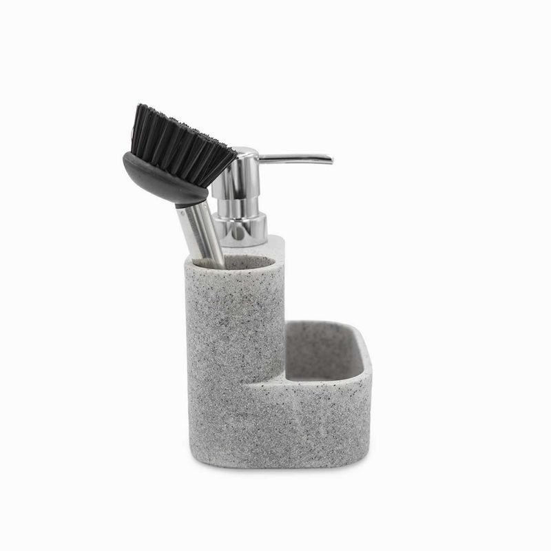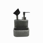 Dispensador de jabón para lavaplatos con espacios para cepillo o esponjilla, decorativo y funcional. Caracterizado por su color gris, su diseño limpio y minimalista va con cualquier decoración, tiene capacidad para 170 ml.