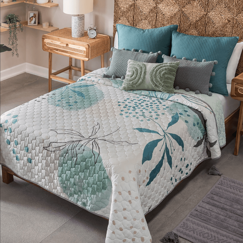 Crea un ambiente elegante y moderno con este cubrelecho. Sus tonos azules y verdes contrastan de manera armoniosa e ideal para tu habitación. Cubrelecho doble vista ultradelgado con capitonado especial. Dos vistas lisas para mayor versatilidad. Muy ligero, fácil de guardar y lavar en casa. Al mejor precio. NO INCLUYE ACCESORIOS. DOBLE FAZ