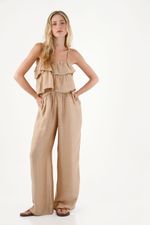 Este all in one está confeccionado en una tela con caída fluida y un sutil brillo, que aporta movimiento, frescura y un toque sofisticado ideal para el día a día o para ocasiones especiales. El escote con boleros añade un aire femenino y delicado, mientras que las tiras ajustables permiten un ajuste personalizado y cómodo. Su diseño se adapta suavemente en la cintura con elástico, definiendo la silueta sin perder amplitud ni libertad. El pantalón de silueta amplia y bota recta complementa la prenda con un estilo moderno y relajado que estiliza y favorece la figura.