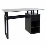 Escritorio, con estructura metálica y vidrio templado negro en su superficie, Tiene un cajón y entrepaños para ubicar múltiples objetos de trabajo y estudio. Su diseño elegante lo hacen ideal para tus espacios.