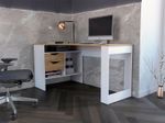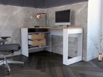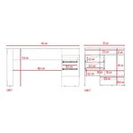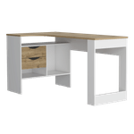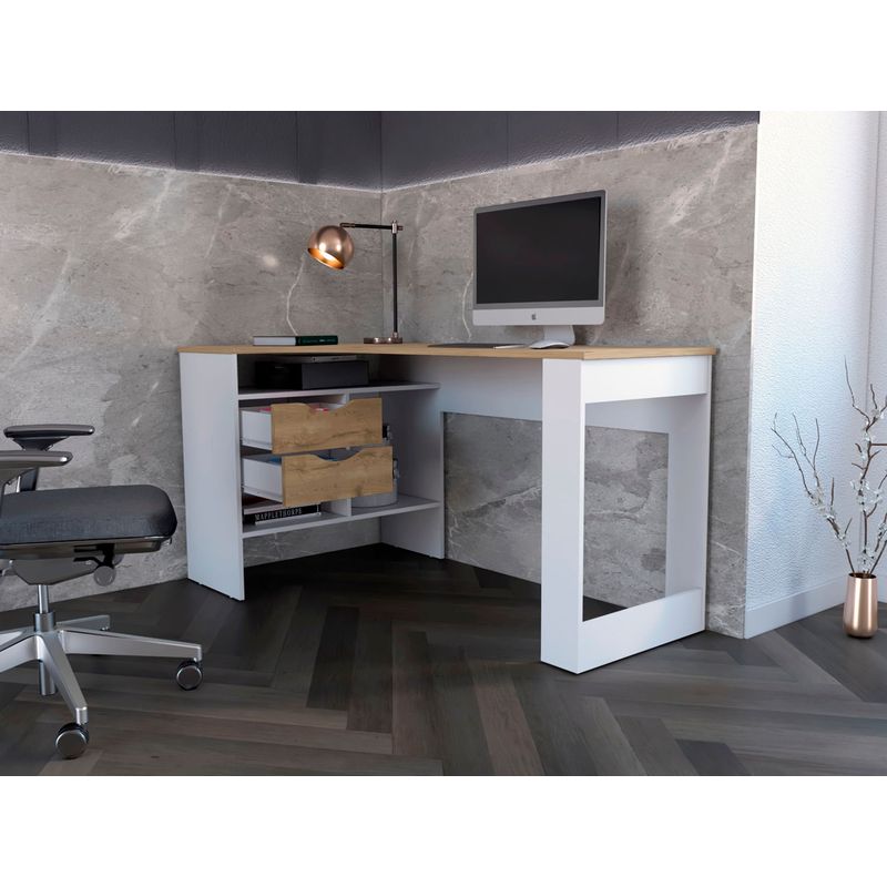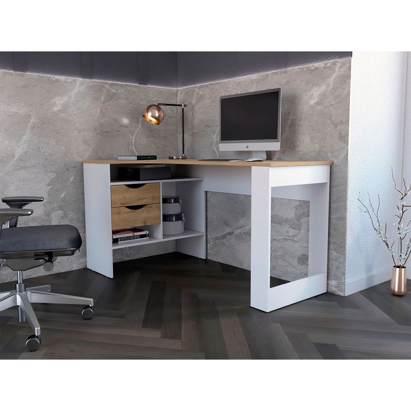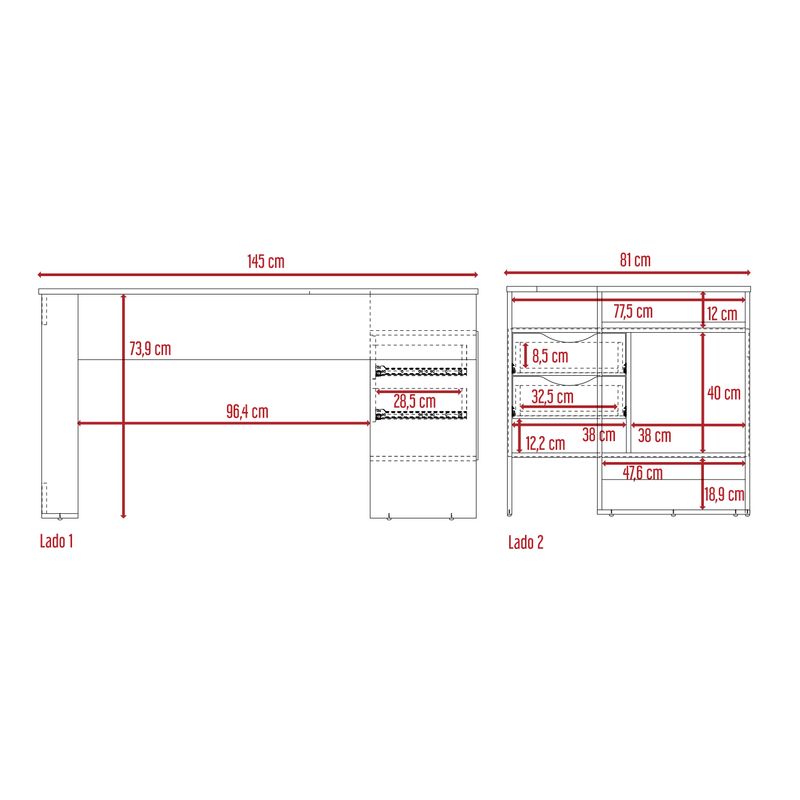 Escritorio en L con amplia supeficie, combinacion de colores, dos cajones de almacenamiento, facil armado con medidas de: ALTO 76,3 ANCHO 145 FONDO 81