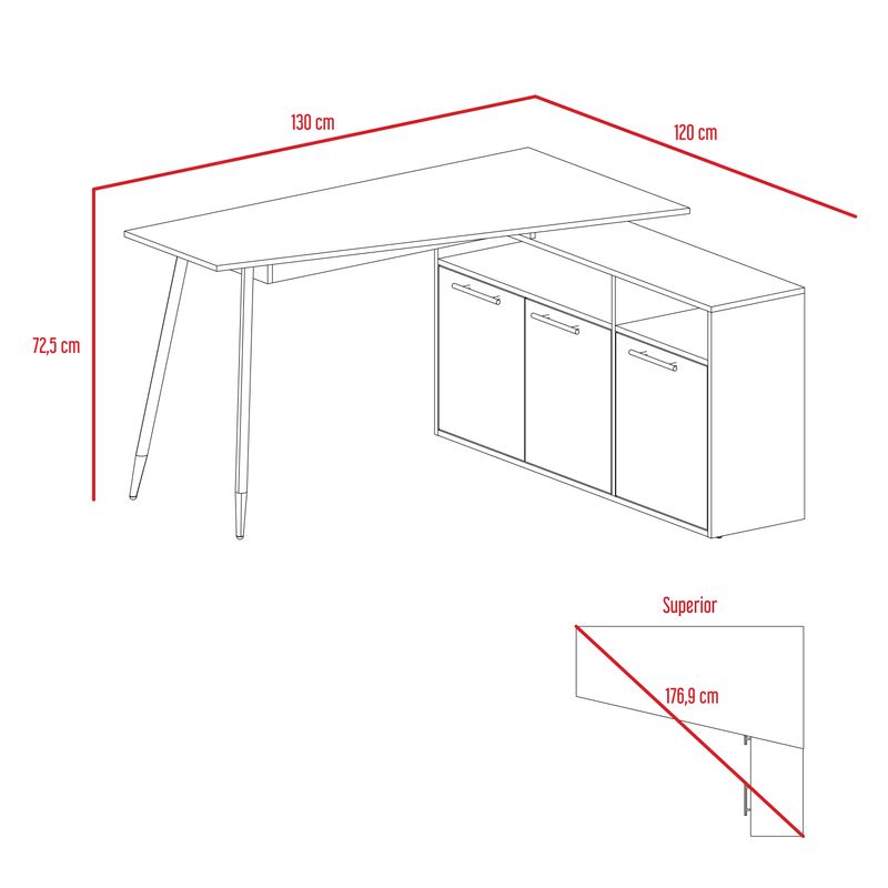 Escritorio con diseño moderno, amplia superficie de trabajo, patas de madera y tres puertas abatibles con medidas de: ANCHO 72,5 ALTO 130 PROFUNDO 120