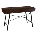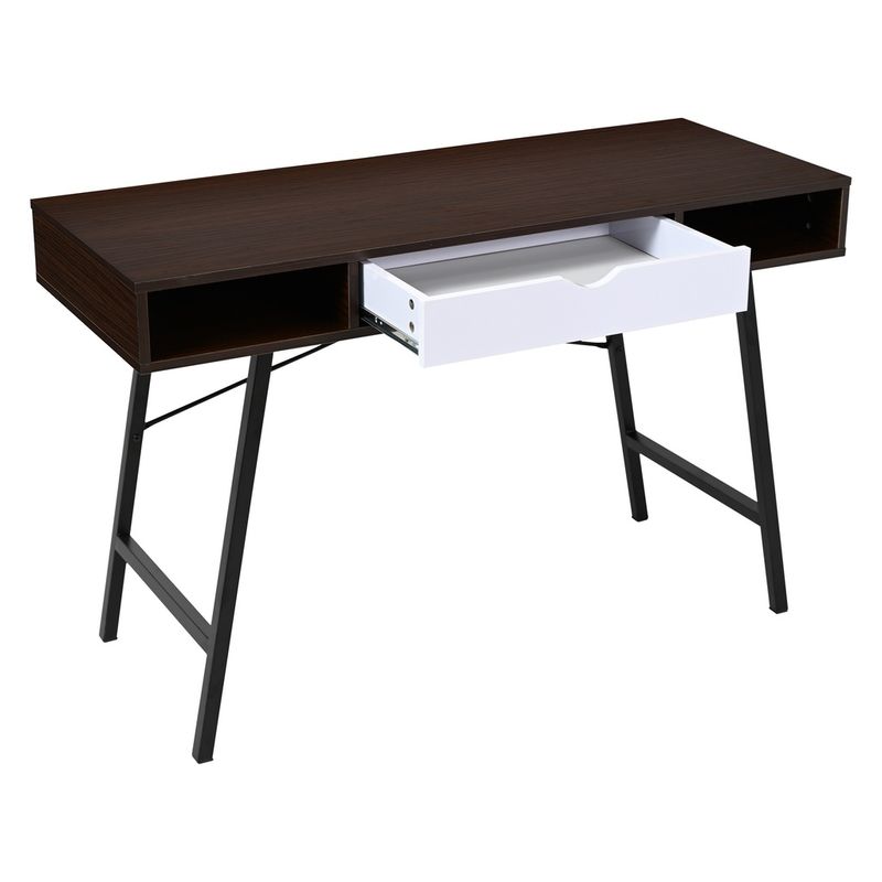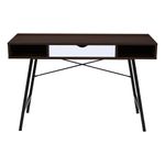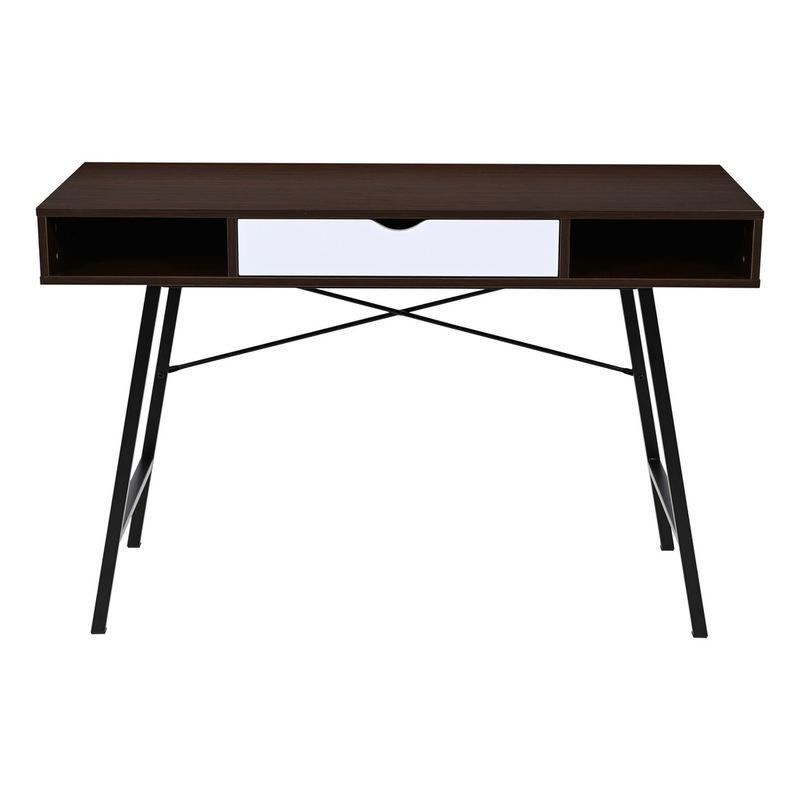 Escritorio fabricado en MDP color Castaño con un recubriendo en melamina de 15 mm que facilita la limpieza de las superficies, su elegante acabado en madera oscura con detalles en blanco aporta un toque contemporáneo, mientras que su estructura metálica negra garantiza estabilidad y durabilidad. Ideal para mantener todo organizado gracias a su cajón central y dos compartimentos abiertos.
