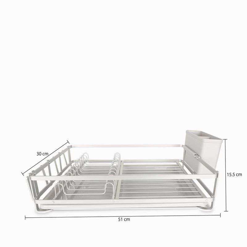 Escurridor gris diseñado para el secado de platos, tazones, utensilios y vasos. Cuenta con ranuras que permiten un secado rápido tras el lavado y con una bandeja de goteo que evita que la encimera se moje. Es un accesorio discreto en tamaño y color, ocupando poco espacio en el mesón de la cocina. Gracias a su material duradero, es fácil de limpiar y muy práctico.