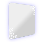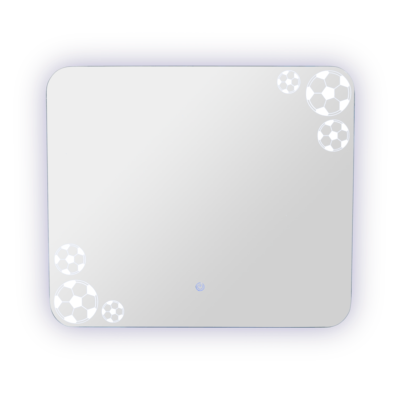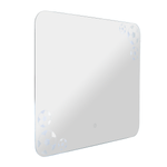 Espejo rectangular con bordes redondeados en Cal 4mm con sandblasting, iluminación LED + Touch, cuenta con chaflán