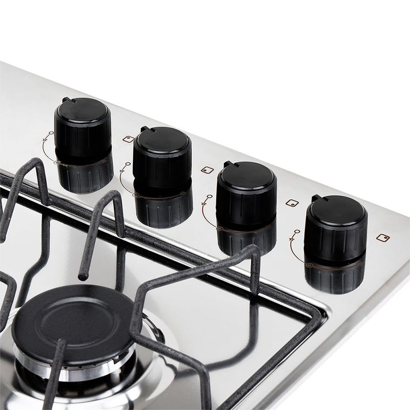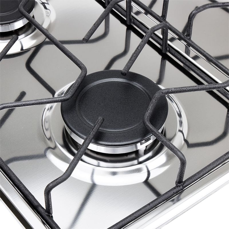 Estufa de empotrar a gas de 60x43 cm, 4 fogones de diferentes tamaños y un fogón rápido. Parrillas continuas para más estabilidad. Encendido automático y fácil de limpiar.