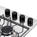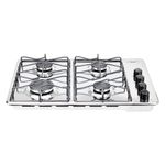 Estufa de empotrar a gas de 60x43 cm, con 4 fogones de diferentes tamaños. Parrillas continuas y perillas removibles. Encendido automático y zona antiderrames.