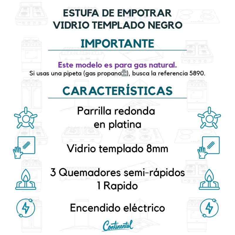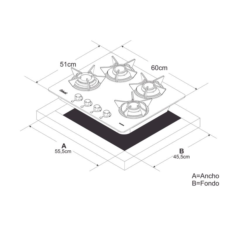 Tiene 4 quemadores, distribuidos en 3 semi-rápidos y 1 rápido ubicado en la parte trasera, ideal para cocciones más ágiles. Como estufa empotrable, es importante revisar las medidas del producto antes de instalarla.