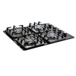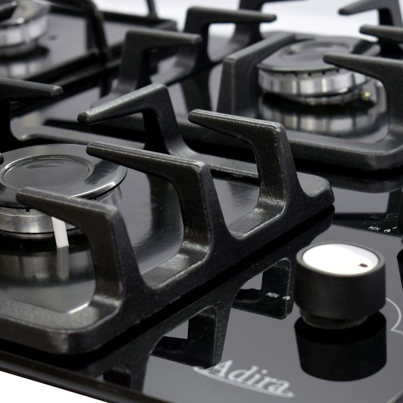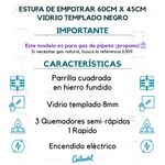 Estufa de empotrar a Gas Propano color Negro en Vidrio Templado de 8 mm de alta resistencia, tiene 4 parrillas cuadradas en Hierro Fundido, con 8 puntos de apoyo para una mejor estabilidad de los recipientes, 4 quemadores en aluminio, 3 semi-rápidos y 1 rápido. Cuenta con encendido electrónico