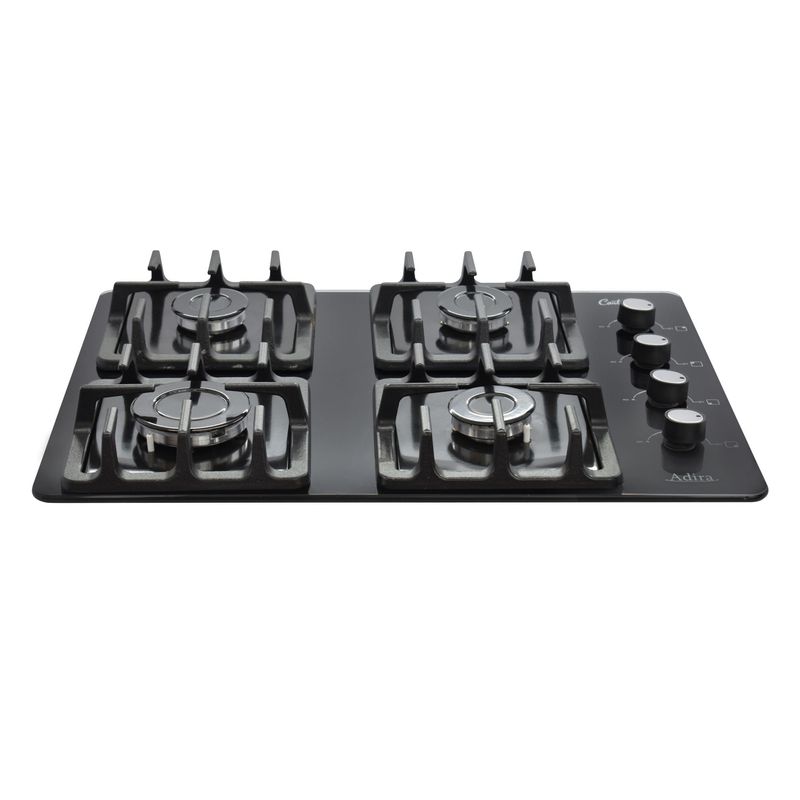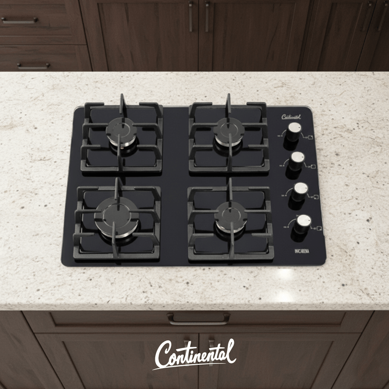Estufa de empotrar a Gas Propano color Negro en Vidrio Templado de 8 mm de alta resistencia, tiene 4 parrillas cuadradas en Platina, con 8 puntos de apoyo para una mejor estabilidad de los recipientes, 4 quemadores en aluminio, 3 semi-rápidos y 1 rápido. Cuenta con encendido electrónico