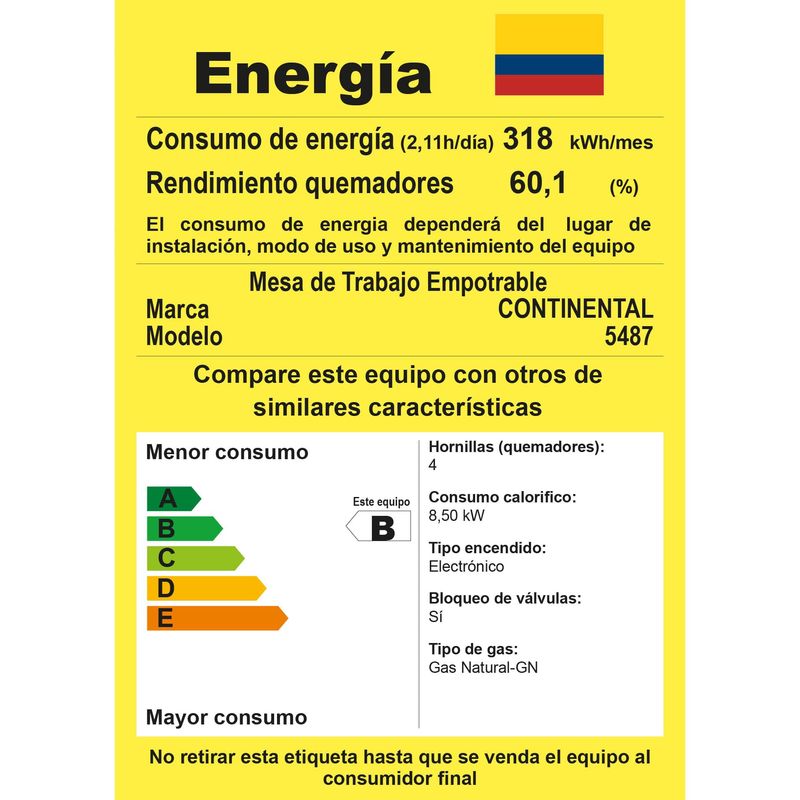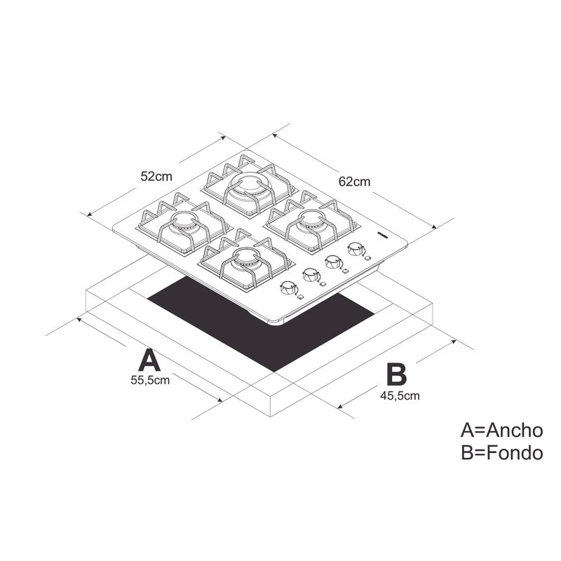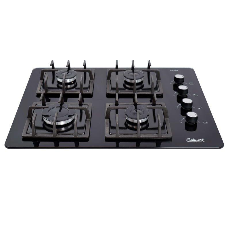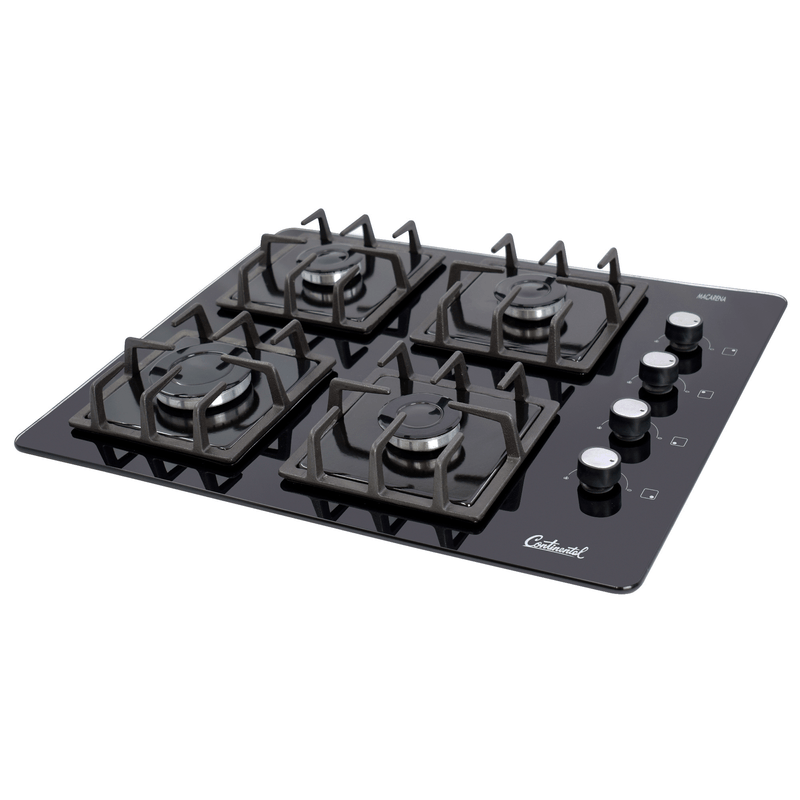 Estufa de empotrar a Gas Natural color Negro en Vidrio Templado de 8 mm de alta resistencia, tiene 4 parrillas cuadradas en Hierro Fundido, con 8 puntos de apoyo para una mejor estabilidad de los recipientes, 4 quemadores en aluminio, 3 semi-rápidos y 1 rápido. Cuenta con encendido electrónico.