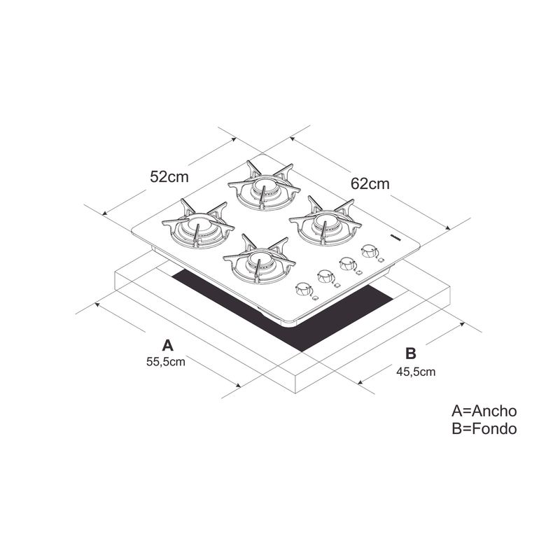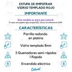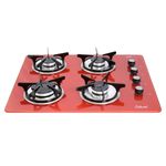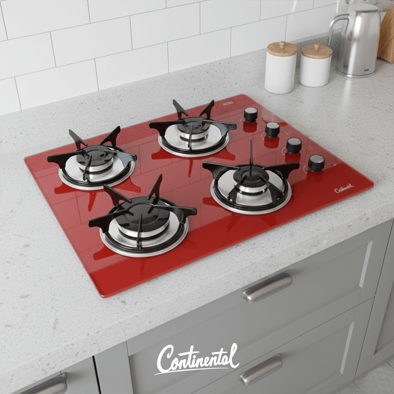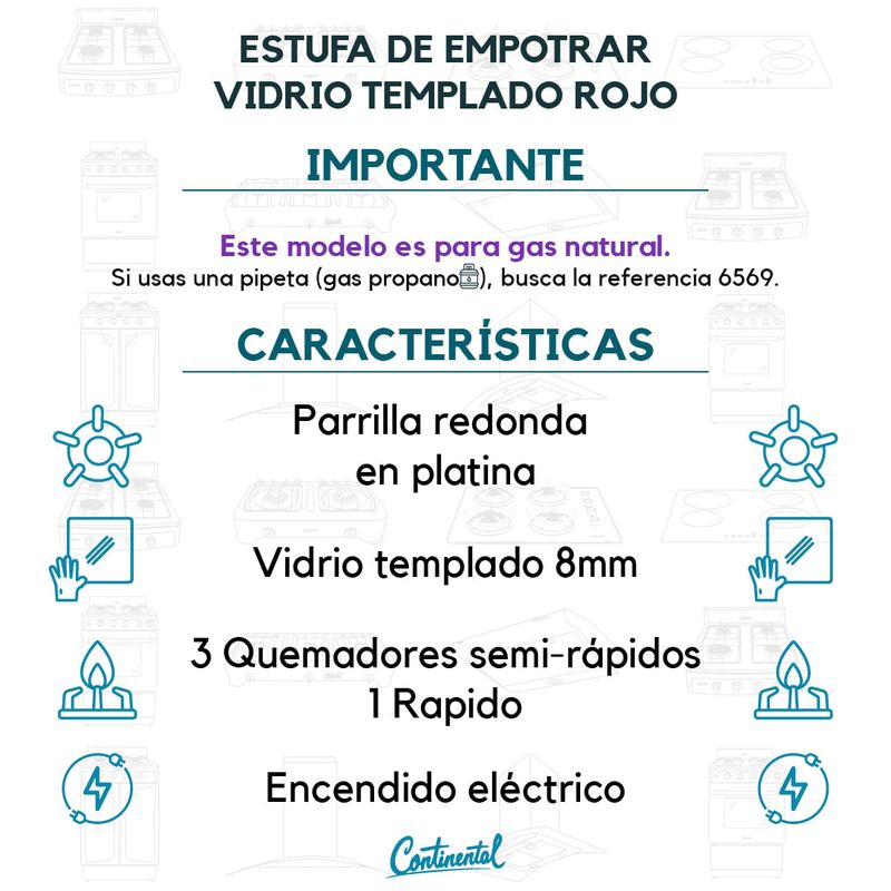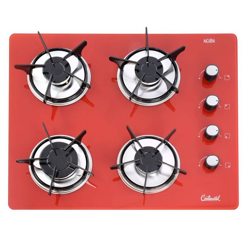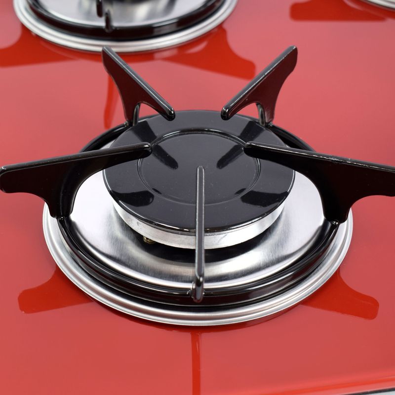 Estufa de empotrar a Gas Natural color Roja en Vidrio Templado de 8 mm de alta resistencia, tiene 4 parrillas redondas en platina, con 5 puntos de apoyo, 4 quemadores en aluminio, 3 semi-rápidos y 1 rápido. Cuenta con encendido electrónico. Medida de Instalación: (55,5 x 45,5) +/- 0.5 cms.