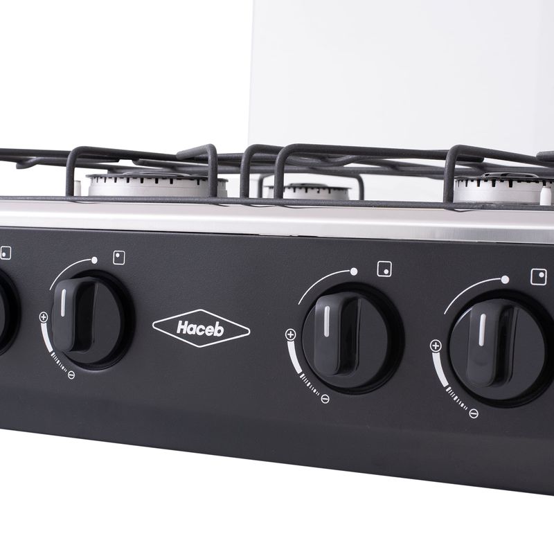 La estufa de mesa negra a gas propano Haceb te ofrece un diseño robusto gracias a su vidrio superior templado y su robusta estructura interior. Sus 3 quemadores semirápidos y 1 quemador rápido se adaptan a tus necesidades ofreciéndote versatilidad en tus preparaciones. Cuenta con parrillas únicas en alambrón para mayor estabilidad y sus perillas ergonómicas tienen un diseño único y de fácil manejo. Su encendido es eléctrico.