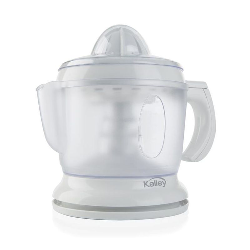 Exprimidor eléctrico Kalley de 30W con capacidad de 1L, 5 niveles de filtrado y sistema de rotación automática. Incluye 2 conos para diferentes cítricos.