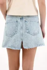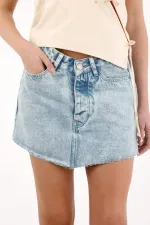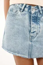 Confeccionada en denim de lavado claro, cuenta con pretina en V, cinco bolsillos funcionales y ajuste con botones expuestos que suman detalle y practicidad. Ruedo asimétrico y desflecado para un acabado moderno y fresco.