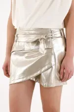 Esta falda corta está confeccionada en un tejido de cuerpo medio con viscosa, detalles metálicos y textura de imitación cuero cómoda que te permitirá moverte con confianza, mientras disfrutas de esa caída recta que te estiliza. Su cinturón en la misma tela y lo detalles cruzados en frente la convierten en una pieza única en su estilo.