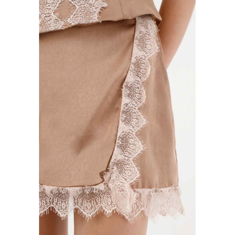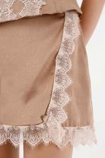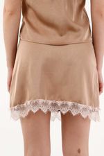 Esta falda corta en satín es el equilibrio perfecto entre sutileza y estilo. Su diseño incluye un delicado encaje en el ruedo y una abertura lateral que aporta movimiento y un toque elegante. El cierre semi invisible en costado asegura un acabado limpio y pulido, ideal para lucir tanto en outfits casuales elevadas como en planes nocturnos.