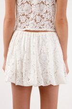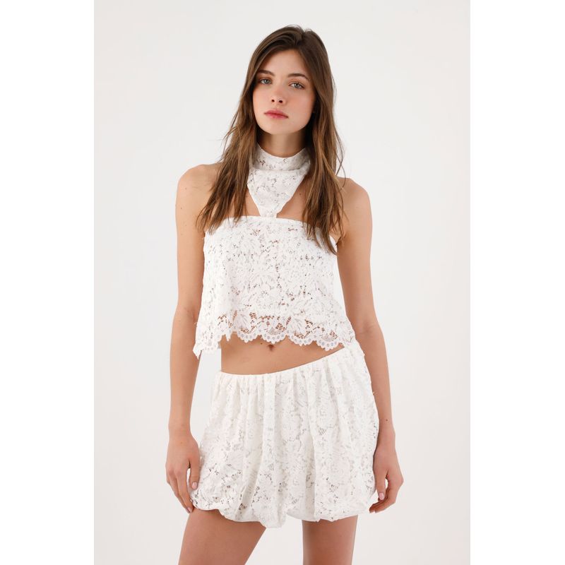Una falda corta de encaje blanco que mezcla romanticismo y calle. El bajo abullonado crea una silueta dinámica con movimiento natural, perfecta para un look femenino sin esfuerzo. La cintura elástica recoge suavemente y te da libertad para moverte, mientras el encaje floral aporta textura y carácter. El forro de viscosa suma confort para que la lleves desde el día hasta la noche con vibra urbana TNS.