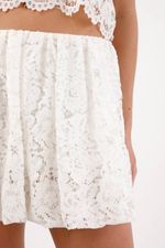 Fit & Styling Fit relajado y corto con caída abullonada. Llévala a la cintura con un top de punto liso entallado en blanco para un set monocromo limpio; el contraste de siluetas equilibra el volumen del bajo y define la figura. Una falda corta de encaje blanca pensada para planes de ciudad y tardes de verano.