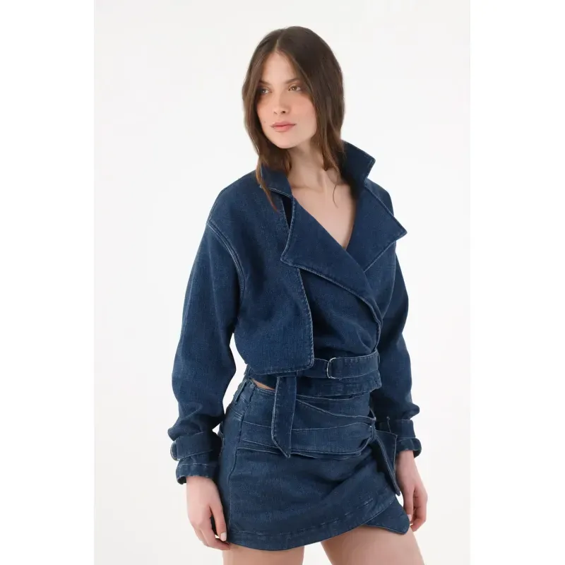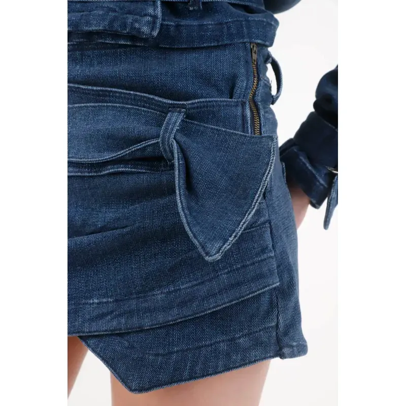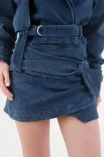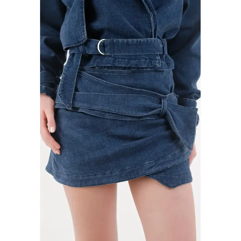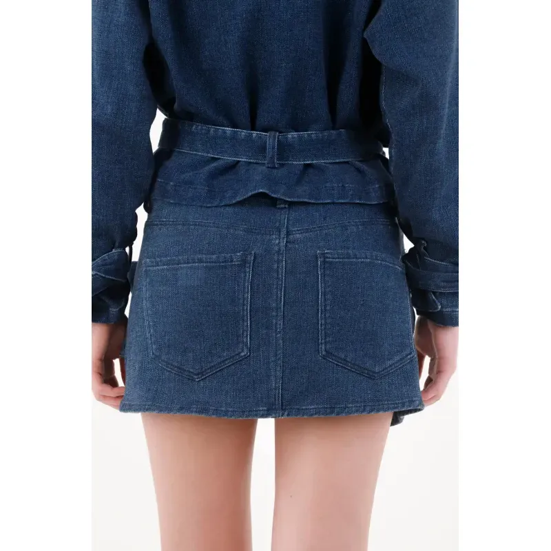 Esta falda denim de TNS define la cintura con un cinturón integrado y paneles cruzados que estilizan sin esfuerzo. El tejido plano pesado en algodón con un toque elástico mantiene la estructura y acompaña el movimiento, para que se vea impecable todo el día. El azul índigo con costuras marcadas suma carácter urbano y la curva del ruedo mini alarga visualmente las piernas.