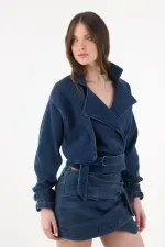 Fit & Styling Talle alto, silueta levemente A y cruce frontal favorecedor. Llévala ceñida en la cintura con un top de punto liso por dentro y completa con una chaqueta corta en el mismo índigo para un look falda denim mujer que funciona del día a la noche.