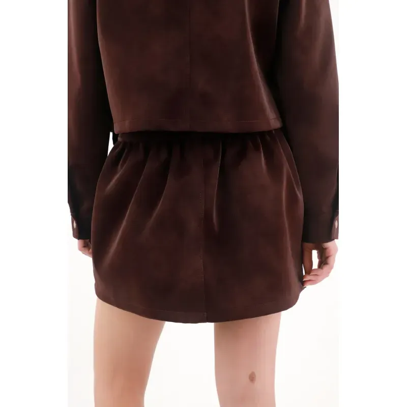 Lo que esta falda corta tiene para decirte se entiende mejor cuando te la pones. Llévala en set con la camisa a juego para un look vino monocromático que grita actitud y se adapta perfecto a salidas de noche o planes donde quieras destacar.