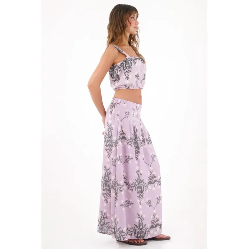 Con su estampado floral lleno de vida, esta falda se convierte en la protagonista de un look versátil y romántico. Los prenses en el delantero aportan caída natural y amplitud, mientras la pretina lisa en frente estiliza la figura y la pretina elástica en posterior brinda comodidad al ajuste.