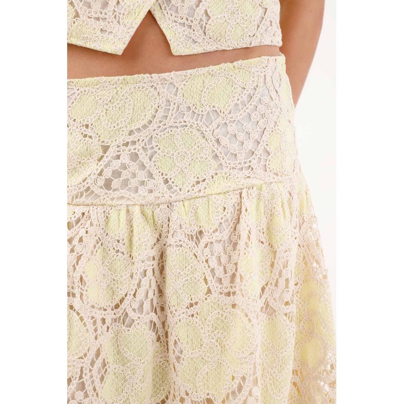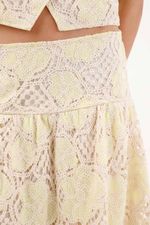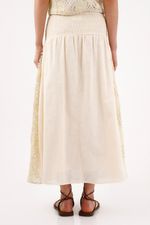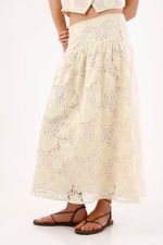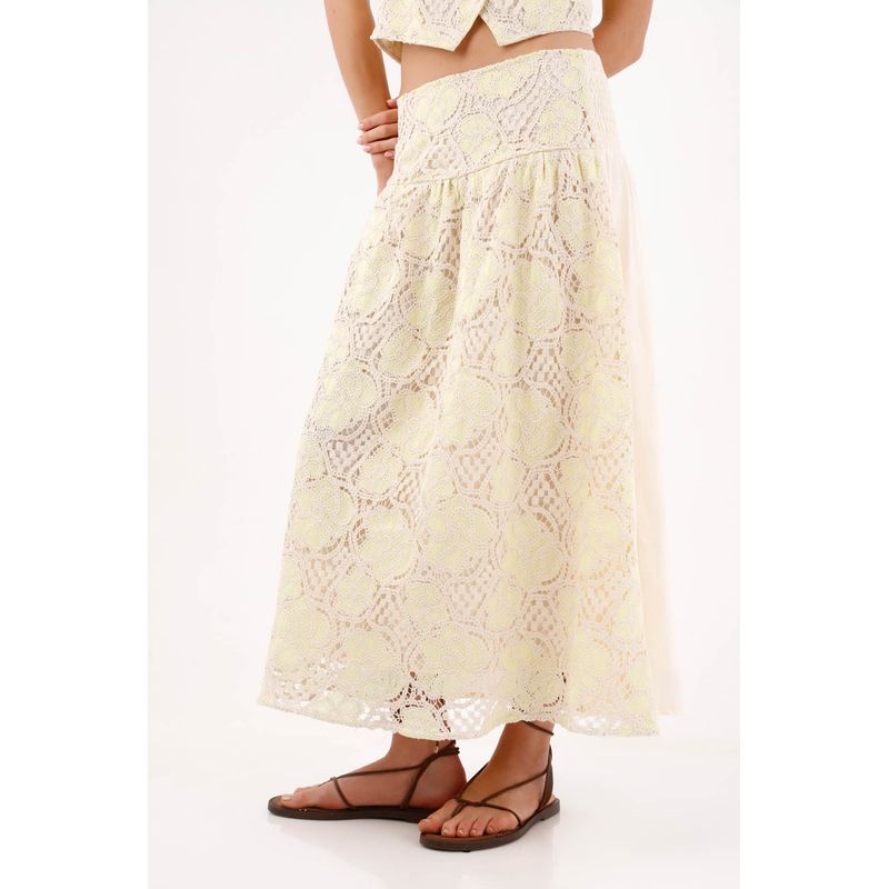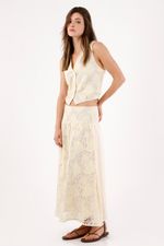 Esta falda larga de algodón apuesta por un encaje crochet floral en tono marfil que dibuja una textura gráfica sutil; es el detalle que capta la luz y suma frescura urbana. La pretina ancha enmarca la cintura y da paso a una silueta evasé que cae limpia hasta el tobillo, creando un efecto alargado y femenino. El forro de algodón acompaña la caída del calado y mantiene la estética delicada del conjunto.