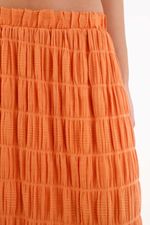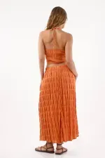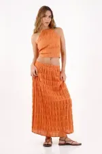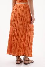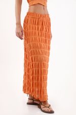 Textura que baila con cada paso. Esta falda larga naranja de TNS convierte el movimiento en estilo gracias a su tejido con franjas arrugadas que aporta relieve y un ritmo visual fresco. La pretina elástica visible abraza la cintura y mantiene el frente limpio para un look fácil de llevar. El largo maxi dibuja una silueta fluida y favorecedora, y el forro de viscosa acompaña la caída para un porte natural y cómodo.