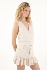 Esta falda corta para mujer está diseñada en una silueta moderna que combina practicidad con un toque femenino. Su confección en tela plana bordada le da un acabado especial y delicado, mientras que el corte con bolero en el ruedo aporta volumen sutil y un efecto visual muy actual. Además, cuenta con bolsillos laterales funcionales, un detalle que suma comodidad sin sacrificar estilo. Su ajuste con botón y cierre asegura un fit cómodo y seguro para el día a día.