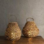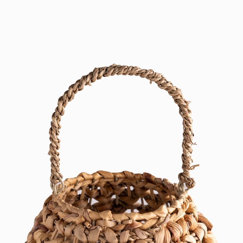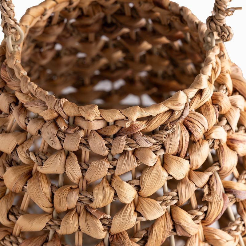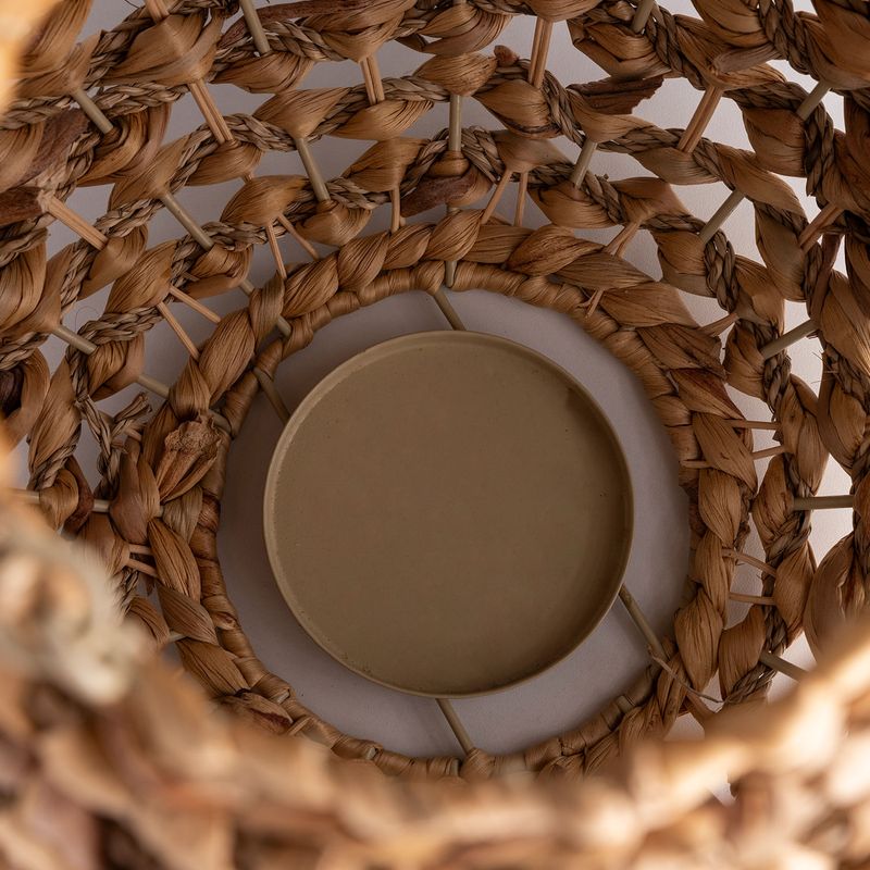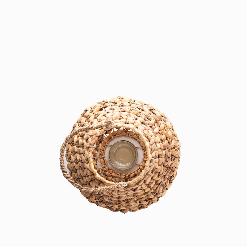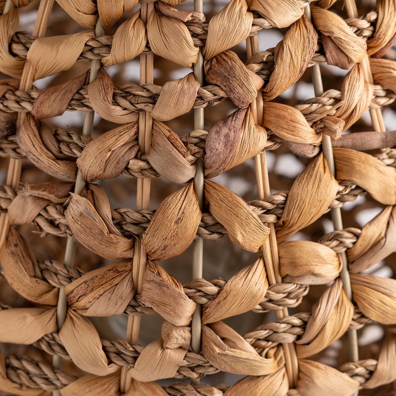 Crea una iluminación ambiental y acogedora, proyectando patrones de sombra y luz a través de su trenzado. Su diseño que fusiona jacinto de agua, hierba marina y ratán se convierte en una pieza decorativa de textura rica y compleja. Extremadamente ligero y portátil, es perfecto para decorar mesas, suelos o espacios exteriores cubiertos con un toque bohemio.
