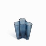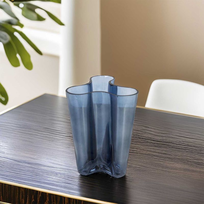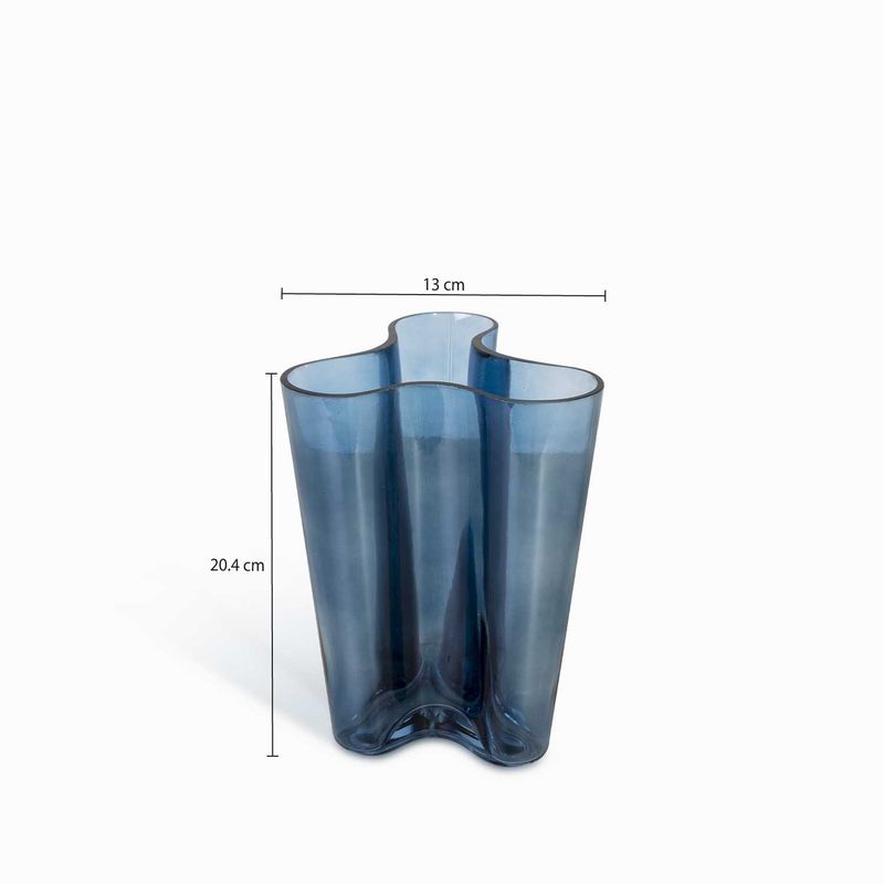 Florero Trivio, elaborado en vidrio de borosilicato y de color azul oscuro. Con diseño abstracto, color translucido y funcional. Con acabados en forma redondeada e ideal para complementar bibliotecas, escritorios, oficinas y salas.