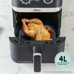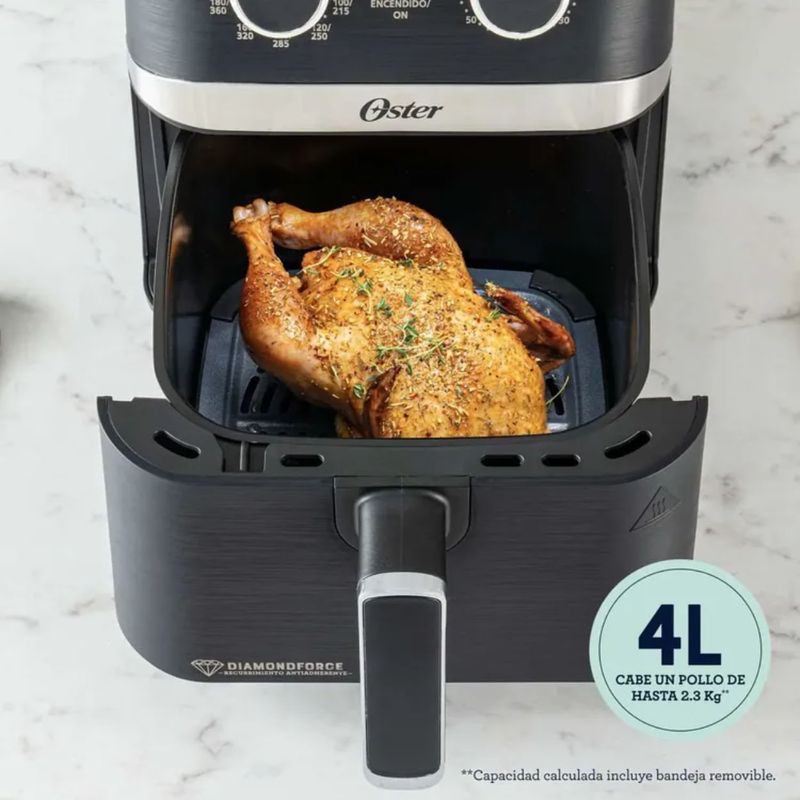 Experimenta una nueva era en la preparación de alimentos con nuestra innovadora freidora de aire manual Oster®. Nuestra freidora cuenta con el recubrimiento Oster® DiamondForce, que es hasta 12 veces más resistente a rayaduras y hasta 15 veces más fácil de limpiar* que los recubrimientos convencionales. Su capacidad de 4L** permite cocinar un pollo de hasta 2.3Kg. Con sus controles intuitivos para ajustar el tiempo y la temperatura, podrás adaptar fácilmente la cocción a tus necesidades y preferencias culinarias. Disfruta de comidas deliciosas y saludables con menos aceite y sin sacrificar el sabor ni la textura crujiente que tanto te gusta. ¡Simplifica tu experiencia en la cocina y descubre un mundo de posibilidades gastronómicas con nuestra freidora de aire manual Oster®! *Hasta 12 veces más resistente a rayaduras y hasta 15 veces más fácil de limpiar Vs recubrimiento GSCB-293V/GSCT-293V **Capacidad calculada incluye bandeja removible
