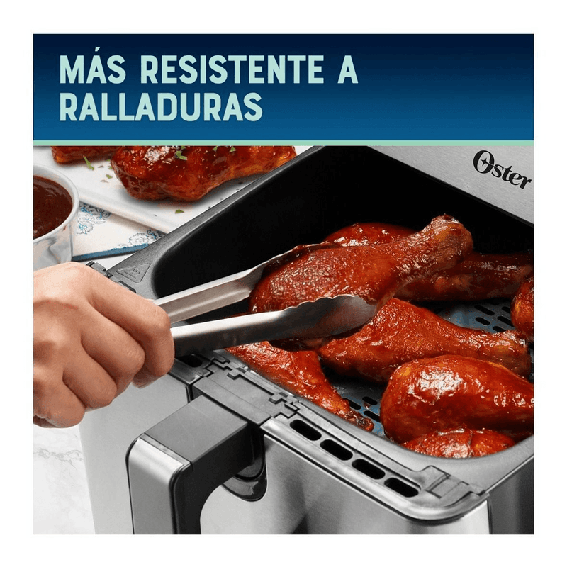 TECNOLOGÍA OSTER® DIAMONDFORCE INCREÍBLE, PERO CIERTO La freidora de aire digital Oster® con capacidad extra grande de 9L es la opción ideal para preparar comidas completas para toda la familia incluyendo pizzas personales y hasta un pollo entero de 2.9Kg. Con revestimiento antiadherente DiamondForce infundido con partículas de diamante que la hace 12 veces más duradero y resistente a rayaduras* y hasta 15 veces más fácil de limpiar 6 FUNCIONES PREDETERMINADAS Con panel digital y 6 funciones preestablecidas, puedes preparar papas fritas, pollo, pescado, carne, pizza y postres al toque de un botón. UNA MANERA MÁS SALUDABLE DE FREÍR Crea una variedad de comidas deliciosas y saludables, siempre con resultados perfectamente crujientes, sin exceso de aceite o grasas. Utiliza un 99.5% menos aceite*. *Comparado con freidoras tradicionales. 20% MÁS CAPACIDAD* Te permite cocinar un pollo entero de hasta 6,3 libras o de 2,9 kilos. QUÉ ES OSTER® DIAMONDFORCE? Nuestro revestimiento antiadherente está reforzado e infundido con partículas de diamante que forman una matriz estructural, creando un revestimiento más fuerte y proporcionando una fácil liberación de alimentos, y un rendimiento superior a lo largo del tiempo. 15 VECES MÁS FÁCIL DE LIMPIAR* * Contra recubrimiento GSCB-293V/ GSCT-293V REJILLA DESMONTABLE Bandeja de freír con aire extraíble para más espacio y fácil limpieza. REVESTIMIENTO ANTIADHERENTE 12 veces más duradero y resistente a rayaduras** ** CONTRA RECUBRIMIENTO GSCB-293V/ GSCT-293V