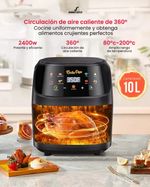 Perfecto para preparar carnes, empanadas, pinchos, chicharron, chorizo, pasteles, tortas, aros de cebolla, papas fritas, bistec, pollo y mucho más. Debido a que la fritura con aire no usa aceite, hay menos olor, menos salpicaduras y menos desorden en comparación con las freidoras tradicionales. El control de temperatura ajustable y el temporizador simplifican la operación. La canasta extraíble contiene hasta 10 Litros de comida y está recubierta con una capa antiadherente para facilitar la limpieza.