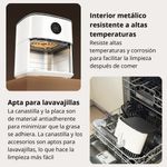 La canastilla y la placa son de material antiadherente para minimizar que la grasa se adhiera. La canastilla y los accesorios son aptos para lavavajillas, lo que hace la limpieza más fácil.
